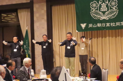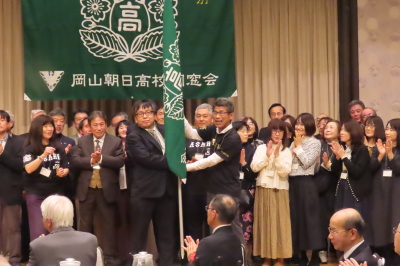 | S58卒横田さんから、S59卒杉本さんへ同窓会旗が渡されました。 | 当番学年と次年度当番学年のみなさん |