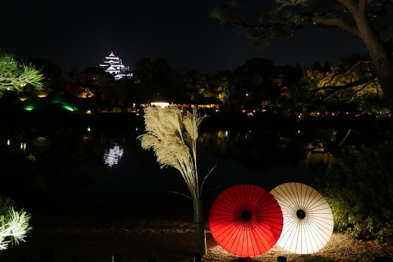 紅葉に合う色とりどりの和傘と赤・白の和傘を織り交ぜて設置し、秋らしさを創出