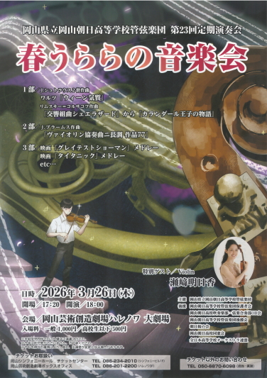 私たち岡山県立岡山朝日高等学校管弦楽団は、2026年3月26日(木)に、岡山芸術創造劇場ハレノワにて第23回定期演奏会「春うららの音楽会」を開催いたします。