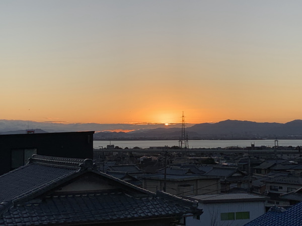 滋賀県大津市、琵琶湖越しに望む初日の出